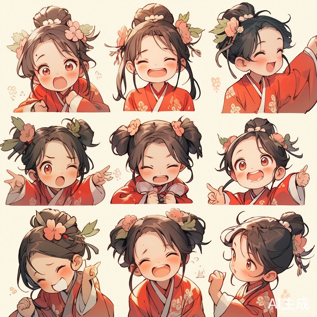 一个中国小男孩,漂亮的五官 黑发,绿色衣服,闪闪大大的眼睛,各种姿势表情,呆萌,托腮,招手,踮起脚尖吻,捧着花,夏天,打着伞,
