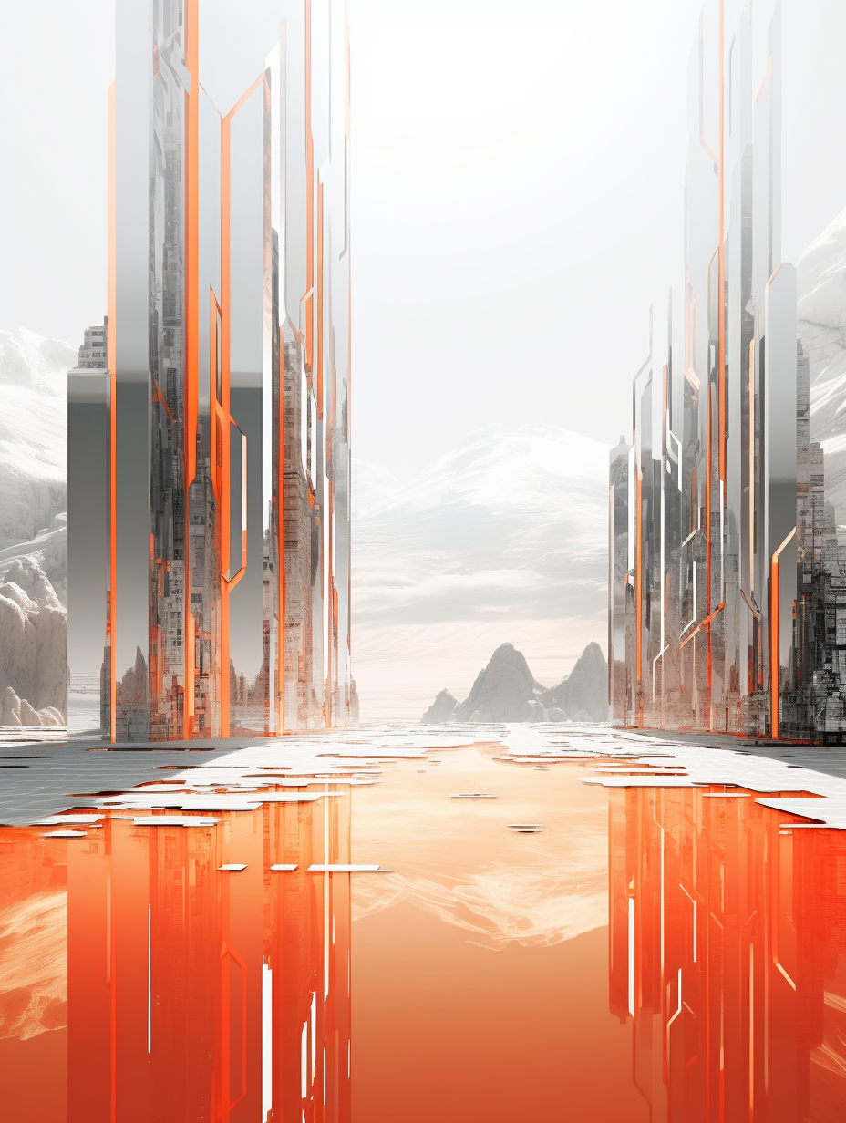 Minimalist aesthetic landscape style, orange plus silver plus white, glass texture, transparent, translucent, soft tones, technological sense