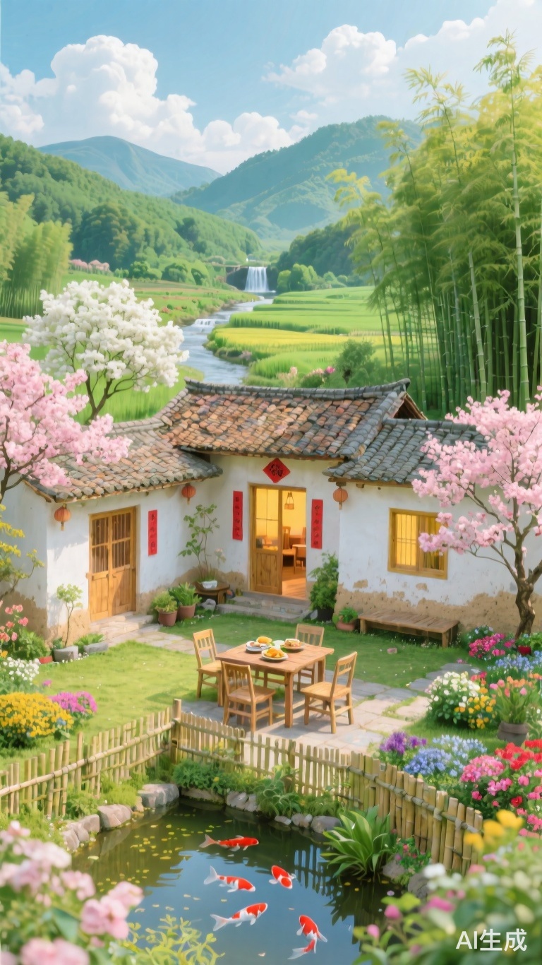 乡村傍晚时分,一对老年夫妇在湖边小屋,小屋为茅草屋顶,土坯墙面,墙上贴有红色“福”字,屋内透出暖黄色灯光 ,烟囱冒着袅袅炊烟。小屋旁有木栅栏,上面晾晒着衣物,栅栏边摆放色彩缤纷的花卉盆栽。一位中国老爷爷老人坐在竹椅上专注钓鱼,另一位中国老奶奶弯腰在菜园劳作。屋前湖水清澈,水面上游着两只鸭子。周边环境有青山环绕,远处山峦朦胧,天空呈现黄昏色调,屋旁桃树枝头挂满桃子果实,屋前摆放古朴木桌木凳,桌上有蓝白相间的茶壶和带红花图案的茶杯,整体氛围宁静祥和、充满生活气息 。
