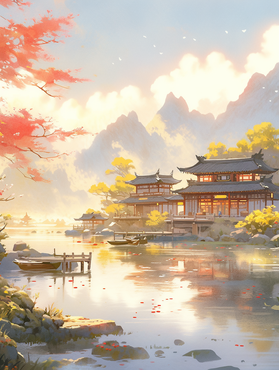 清晨,柔和的晨光斜洒进静谧的庭院,为万物披上一层金黄薄纱。一片梧桐叶悠悠然从枝头飘落,带着青黄渐变的脉络,在慢镜头般的光影中轻盈舞动。它缓缓触碰到长满青苔的石阶,那一瞬间,叶片溅起了晶莹的露珠,如细碎的珍珠般飞溅开来,在阳光里闪烁着剔透的光芒。露珠飞溅的特写,将这一美妙瞬间定格。与此同时,背景中隐约传来打更人敲响的「秋报」梆子声,清脆的声响回荡在空气中,更增添了几分秋意的宁静与悠远。