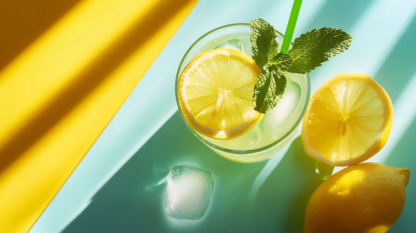 柠檬水,薄荷,冰块,光影,极简主义,绿色清新,产品摄影,超清8K