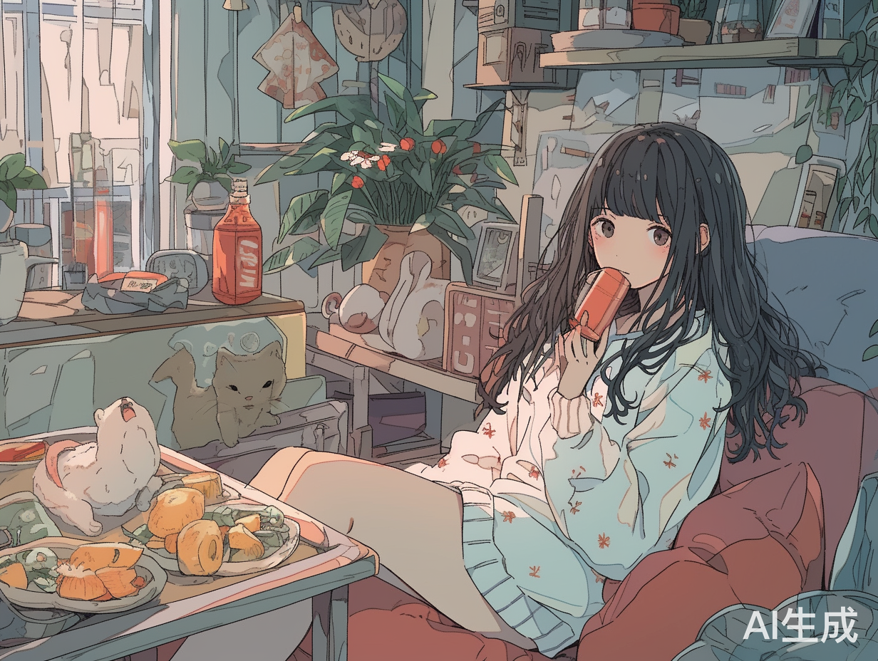 卡通插画,夜晚,一个动漫少女在家看电视,全身照,旁边有零食,水杯,趴着一只小喵咪,慵懒的动作,窗户外有高楼大厦,,远景,色彩丰富,治愈色系