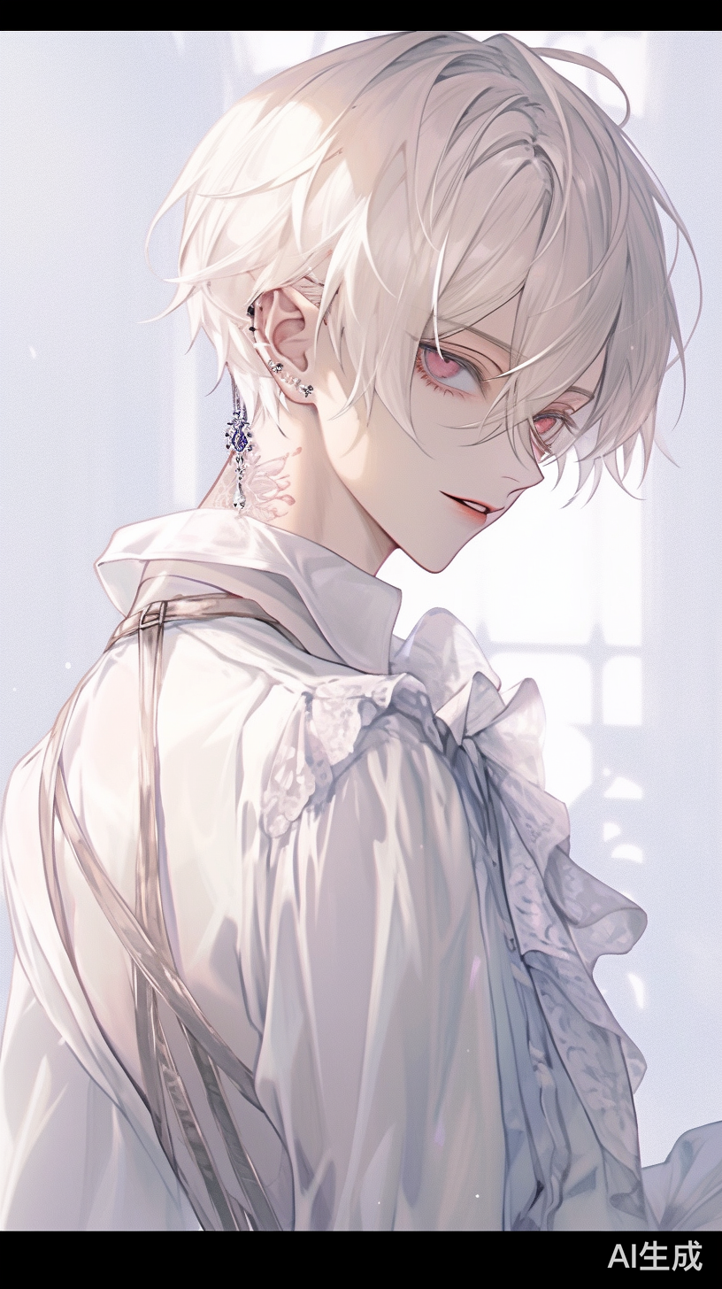 一个拥有白色短发 ,身穿白色衬衫,帅气男性。侯明昊,半身,侧面。